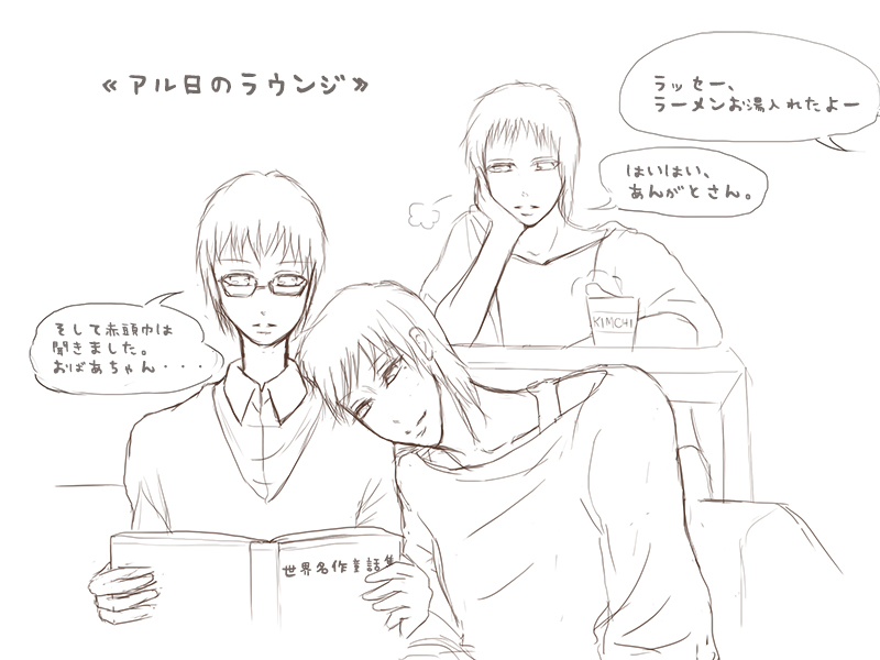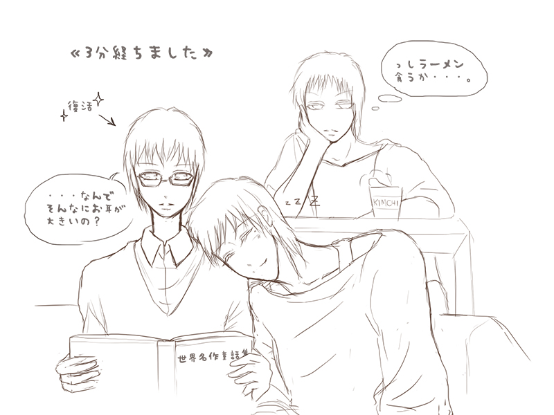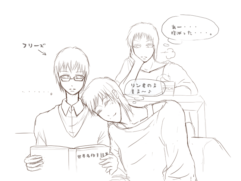 うん、というわけでここまでおまけ絵でした。別タイトルは「リン君の電池切れ」。こういう日常のシーンを描くのが好きな作者です。すいません、おまけ絵がこんなに馬鹿っぽいかつ色気ゼロで。反省します。いや、反省だけしてまたこういうの描くかもね。はは。