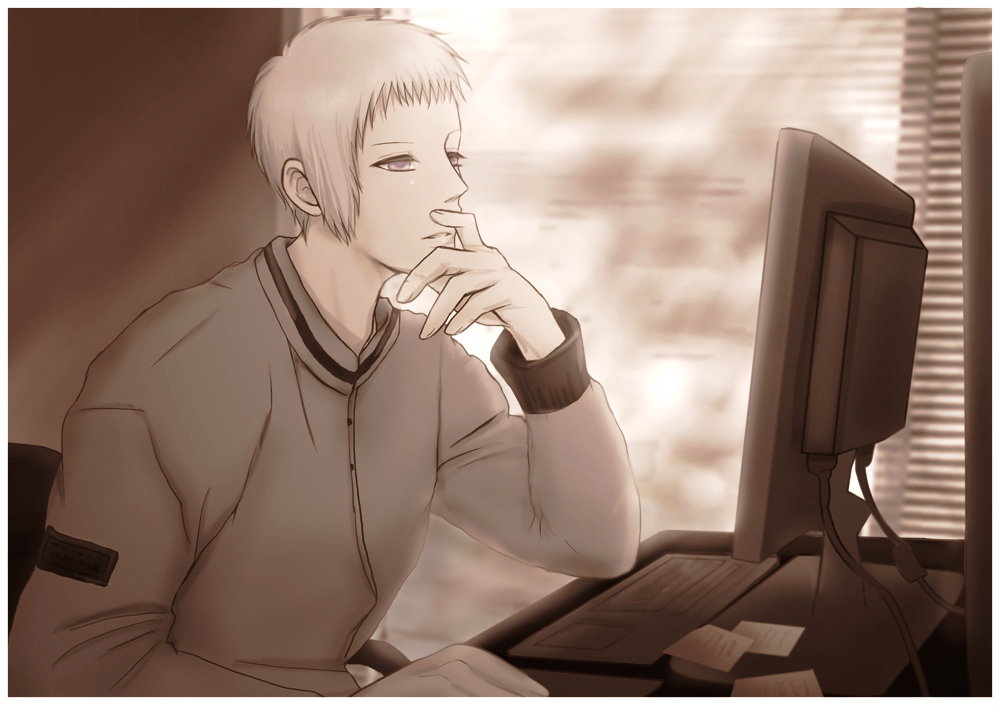 ダーリンがいつぞやか「スタジャンってかっこいいよね。」とか言っていたのを思い出して、なんとなく親分に着せてみました。でもあまり似合っていません。でも描き直すのがめんどくさいのでアップしちゃいます。すいません、親分ファンのみなさん。やっぱり親分は白衣着た方がしっくりするかなー。ラッセの日常風景っていうと、どよーんとした地下室でごちゃごちゃ機械いじってるところとか、ボクシングしてるとことかいいかなって思ったんですが、今回はあくまで爽やかを目指してデスクでお仕事中のシーンを描いてみました。なんにせよ、気に入ってもらえたら作者は幸せです。