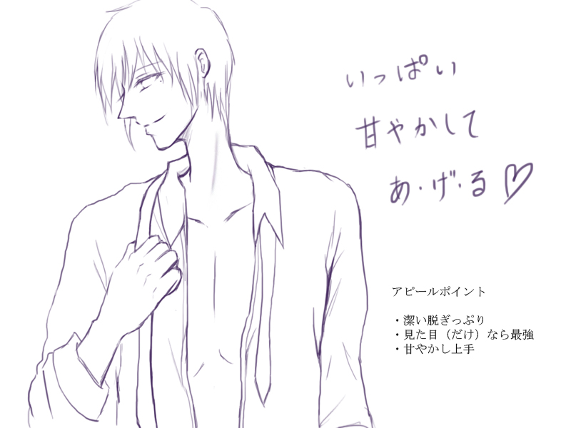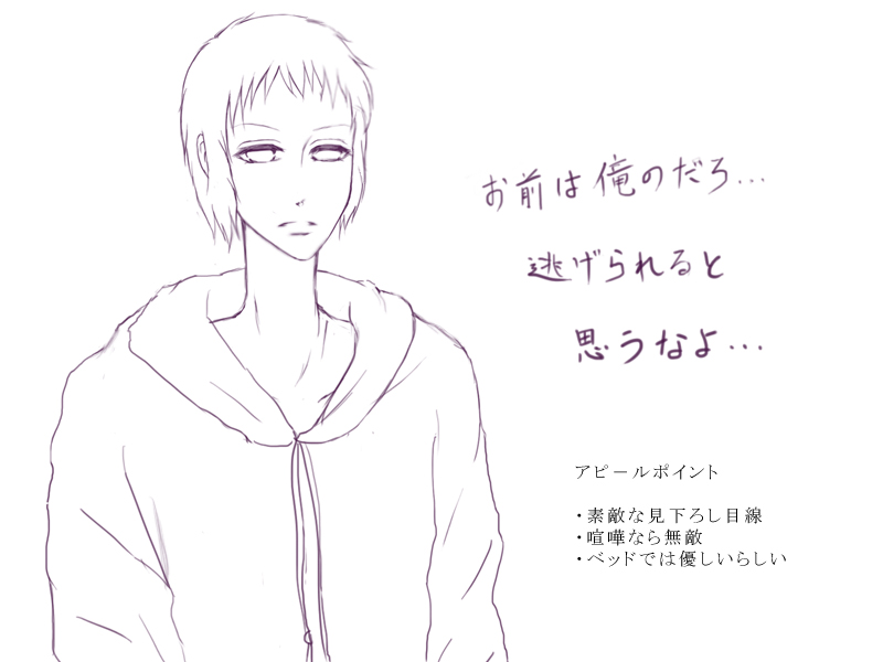今回もラッセ編と同じくNscripterで作ってみてます。コミメカでできなかったことがいろいろできて楽しいです。一旦凝りだすときりがないね、ゲームって。一応後はお話を少し練り直して、地味な打ち込み作業をちまちまとやって、テストプレーして終わりです。本当はもっとスチル描きたいなー・・・なんて欲張りなことを考えていたのですが、ジョシュだけ贔屓ーなんてギヨームが言うに決まっているのでやめておきました。