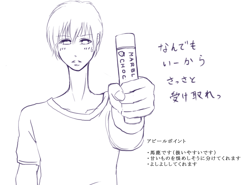 そう、それからラストの自己アピールは今回の番外編の主役です。激しく動揺しています。とりあえず早く彼の渡すチョコを受け取ってやってください。でないとなんだかますます気の毒な顔になりそうです。自己アピール、一体みなさんは誰のアピールが気に入ったでしょうか?ってどれもあんまりアピールになってないかもしれませんね。こういった企画は楽しかったしまたやりたいな~♪
