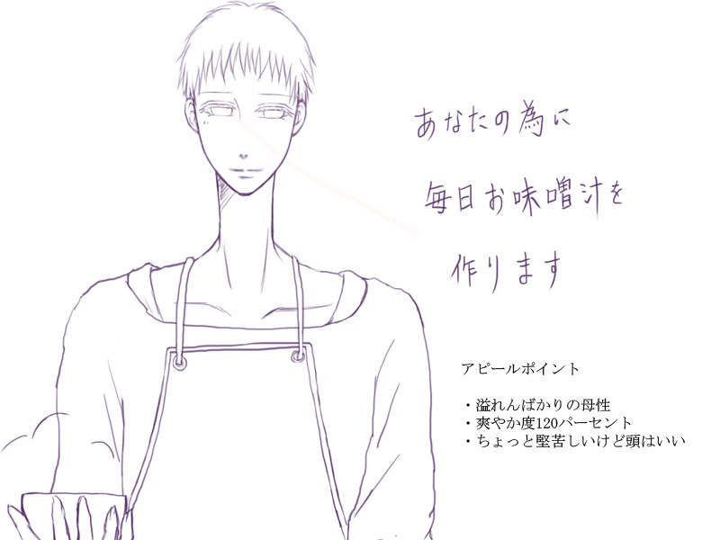 今日自己アピールをしてくれるのはフェリ君です。っていうかさ・・・これ、もう付き合ってくださいとか言う以前にプロポーズだよね。しかも、男らしさをあんまりアピールしてないよ。こ、こんなアピールもありですかねっ。(汗)すいません・・・真面目に企画進行できない作者で。