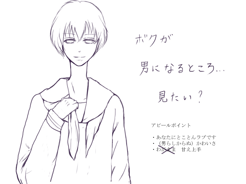 今回もラッセ編と同じくNscripterで作ってみてます。コミメカでできなかったことがいろいろできて楽しいです。一旦凝りだすときりがないね、ゲームって。一応後はお話を少し練り直して、地味な打ち込み作業をちまちまとやって、テストプレーして終わりです。本当はもっとスチル描きたいなー・・・なんて欲張りなことを考えていたのですが、ジョシュだけ贔屓ーなんてギヨームが言うに決まっているのでやめておきました。